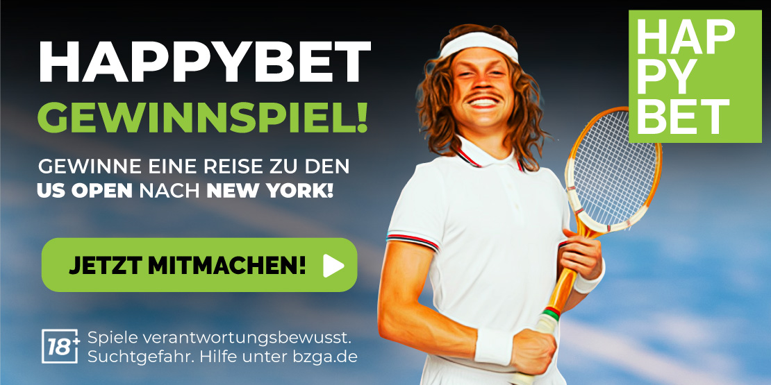 Happybet veranstaltet zu den drei Turnieren in Wimbledon, Hamburg und Kitzbühel Turniersieger-Tippspiele. Wenn du ein Happybet-Konto hast und an zwei der drei Challenges teilnimmst, dann kommst du in die Verlosung um die Reise nach New York. Die gute Nachricht: Du musst mit deinen Tipps nicht richtig liegen - die zweimalige Teilnahme an den Tippspielen reicht schon aus. Nach deiner zweiten Teilnahme bekommst du ein Anmeldeformular zugeschickt.