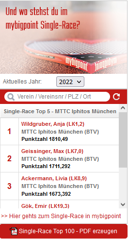 Das beliebte mybigpoint Single-Race ist der nationale Spielerwettbewerb von mybigpoint, bei dem die Spieler:innen, die am Ende des Jahres national die meisten Generali LK-Punkte erspielt haben, mit tollen Preisen prämiert werden. Das mybigpoint Single-Race funktioniert aber auch hervorragend auf Vereinsebene. Die Vereinsmitglieder sehen im Widget auf einen Blick, welche Spielerin oder welcher Spieler des Vereins in diesem Jahr bisher die meisten LK-Punkte erspielt hat und das vereinsinterne Race anführt. Zusätzlich können auch die Top 100 des Vereins als pdf-Datei angezeigt und ausgedruckt oder die Top-Spieler eines anderen Vereins gesucht werden.