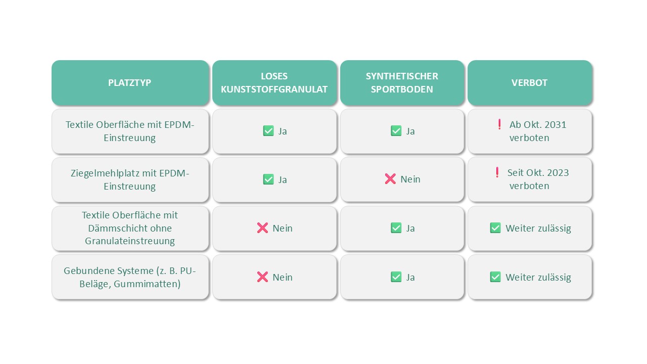 ! Nur wenn beides zutrifft – loses Granulat + synthetische Bodenstruktur – greift das Verbot mit Übergangsfrist bis 2031.