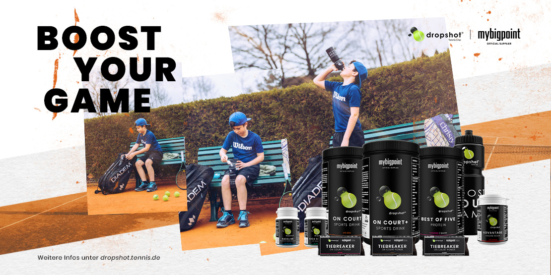 Kurz vor dem Betreten des Tennisplatzes (ca. 10-15 Minuten vorher) solltest du, wie bereits im vorherigen Beitrag erwähnt, erste Kohlenhydrate einnehmen, um die optimale energetische Leistungsbereitschaft herzustellen. Entweder in flüssiger Form oder durch ein kohlenhydratreiches natürliches Produkt wie z. B. die 100% natürlichen dropshot TIEBREAKER Sportriegel. Mehr zu den dropshot TIEBREAKER Riegeln findest du weiter unten.