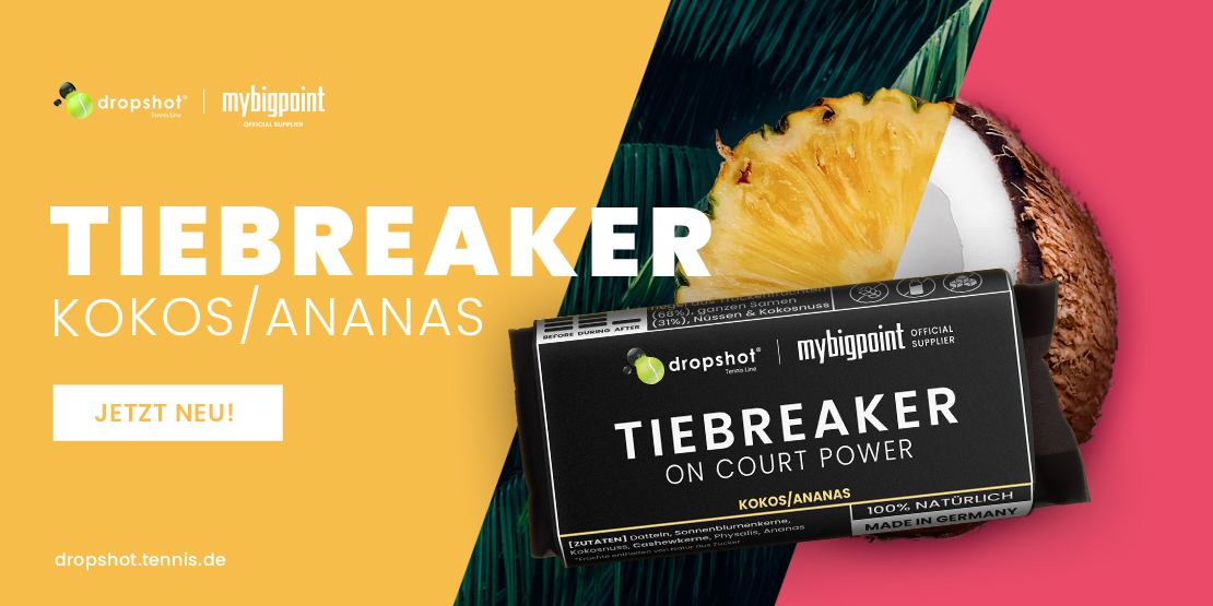 Kurz vor dem Betreten des Tennisplatzes (ca. 10-15 Minuten vorher) solltest du, wie bereits im vorherigen Beitrag erwähnt, erste Kohlenhydrate einnehmen, um die optimale energetische Leistungsbereitschaft herzustellen. Entweder in flüssiger Form oder durch ein kohlenhydratreiches natürliches Produkt wie z. B. die 100% natürlichen dropshot TIEBREAKER Sportriegel. Mehr zu den dropshot TIEBREAKER Riegeln findest du weiter unten.
