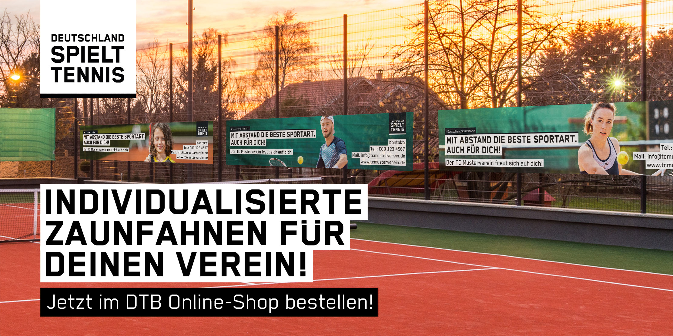 Du möchtest auf deinen Verein aufmerksam machen und neue Mitglieder generieren? Dann haben wir die perfekte Lösung für dich: Die drei Meter langen und mit individuellen Vereinsinformationen bedruckbaren „Deutschland spielt Tennis“-Zaunfahnen sorgen für eine hervorragende Sichtbarkeit des Vereins und sprechen Passanten und potenzielle Neumitglieder direkt an. Ganz nebenbei sorgst du damit auch für einen echten Hingucker, der deine Tennisplätze verschönert und jedes Loch im Zaun verdeckt.