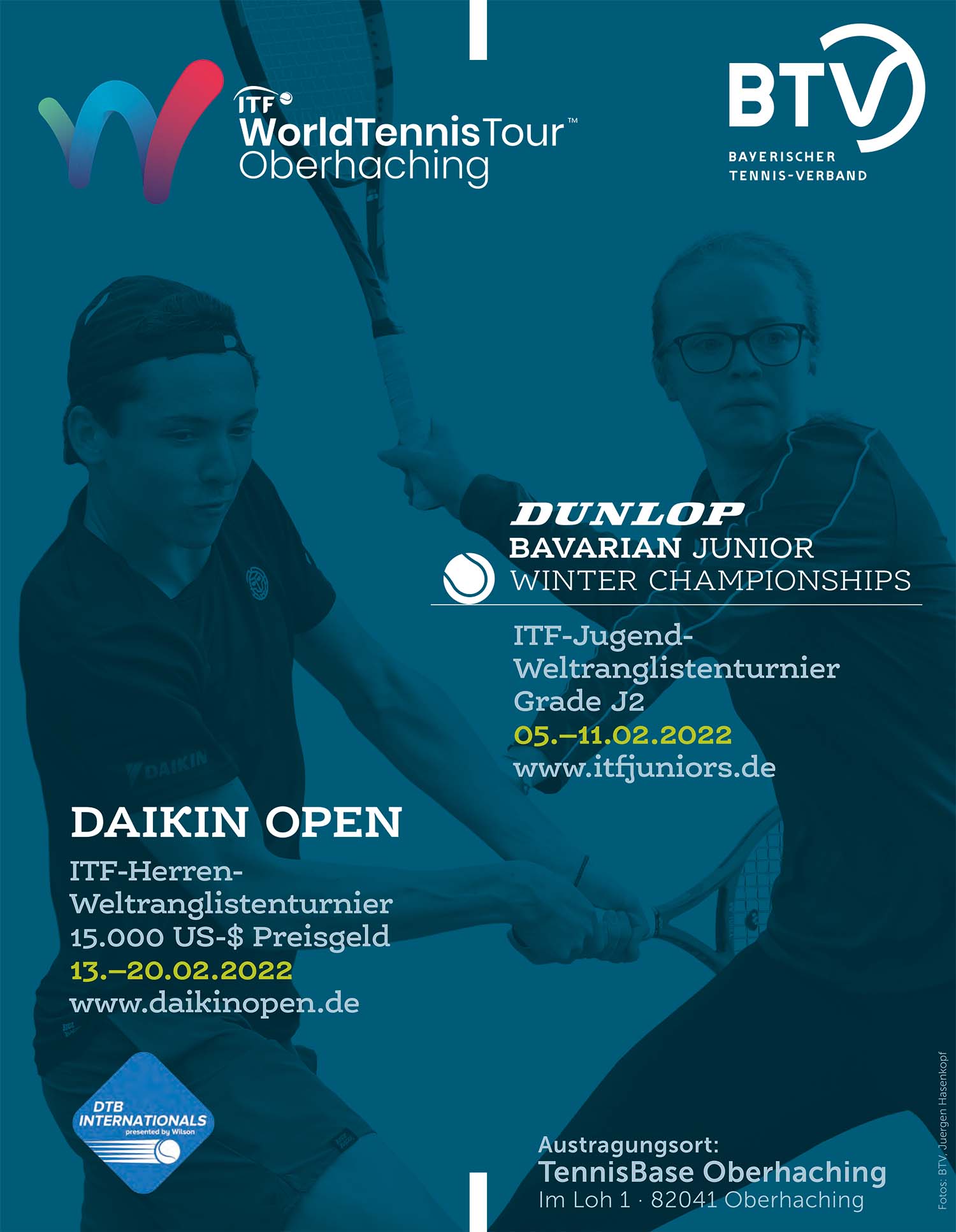 Mit den Dunlop Bavarian Junior Winter Championships und den DAIKIN Open bietet die TennisBase Oberhaching im Februar zwei hochklassige ITF-Turniere für viele der besten Nachwuchsspieler:innen sowie Tennisprofis aus aller Welt. Zuschauer sind unter der Wahrung der aktuellen Corona-Regeln herzlich willkommen, Premium-Mitglieder sparen sich den Eintritt am Final-Wochenende der DAIKIN Open.