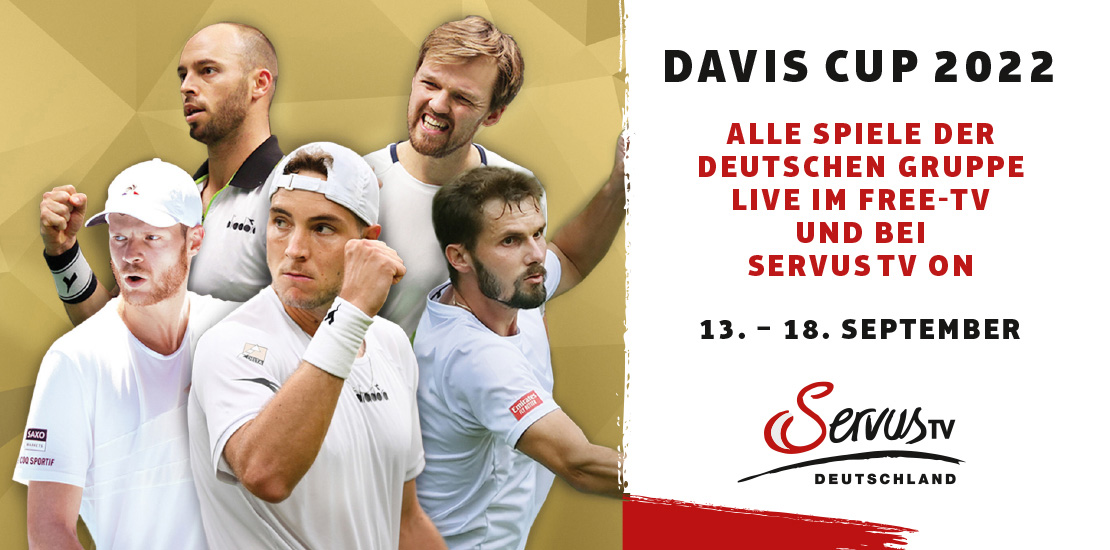 ServusTV Deutschland sichert sich erneut die exklusiven Übertragungsrechte am Davis Cup und hält diese bis einschließlich der Saison 2024. Der Sender zeigt den wichtigsten Wettbewerb für Nationalmannschaften im Herrentennis in diesem Jahr vom 13. bis 18. September täglich ab 14:00 Uhr. Tennis-Fans können alle Spiele mit deutscher Beteiligung sowohl live im Free-TV als auch bei ServusTV On verfolgen. Alle weiteren Matches der deutschen Gruppengegner sind ebenso auf der Streaming-Plattform zu sehen. Für den Davis Cup 2022 ist das ServusTV-On-Air Team, bestehend aus Moderatorin Nicole Oberlechner und den ServusTV-Kommentatoren Markus Theil und Marco Hagemann, im Einsatz. Außerdem versorgt Co-Kommentator Christopher Kas die Zuschauer mit spannenden Insights live vom Ort des Geschehens.