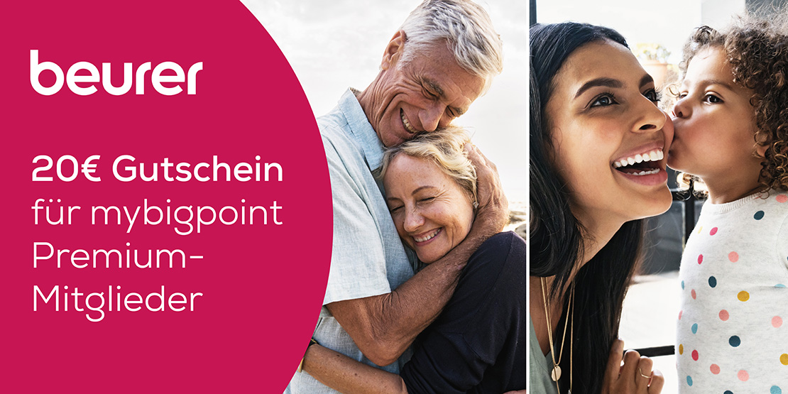 Wir möchten, dass es dir gut geht! Egal ob Diagnosewaage, Massage Gun, EMS-/TENS-Gerät oder Aktivitätstracker – Beurer bietet dir alles, was du fürs Training, Spiel, eine punktgenaue Regeration und mehr Wohlbefinden zu Hause brauchst. Mit mehr als 500 Produkten aus den Themenwelten Wellbeing, Medical, Beauty, Active und Babycare sorgt Beurer für einen gesünderen, schönen Alltag und hilft dir, deine Trainingsziele motiviert umzusetzen. Als offizieller Partner des DTB hat Beurer für die mybigpoint Premium-Mitglieder eine ganz besondere Aktion gestartet, aber auch alle anderen DTB-Mitglieder profitieren von exklusiven Angeboten!