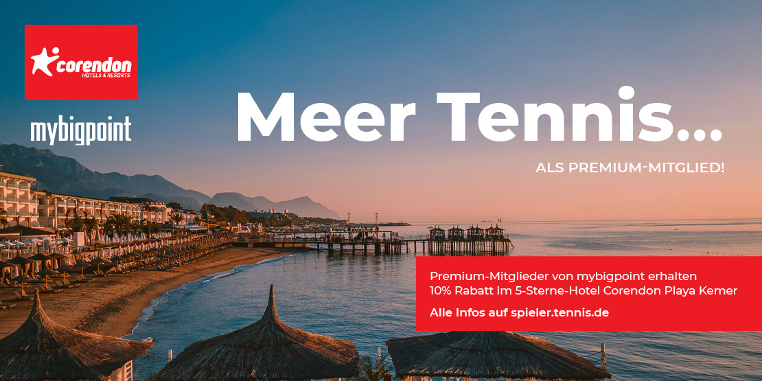 Corendon Hotels ist eine internationale Hotelkette, die dafür bekannt ist, ihren Gästen ein unvergessliches Urlaubserlebnis zu bieten. Jedes Corendon-Hotel bietet einzigartige Merkmale und eine erstklassige Lage, die sowohl den Bedürfnissen von Urlaubern als auch von Geschäftsreisenden gerecht wird. Die Gäste genießen komfortable, moderne Zimmer sowie vielfältige Unterhaltungsmöglichkeiten, Sportanlagen, gastronomische Erlebnisse und einzigartige Aktivitäten. Im 5-Sterne-Hotel Corendon Playa Kemer (Türkei) erwarten dich herausragende Tennismöglichkeiten mit maßgeschneiderten Tennispaketen, professionellem Training und exklusiven Trainingsprogrammen – und als Premium-Mitglied sogar 10% Rabatt!
