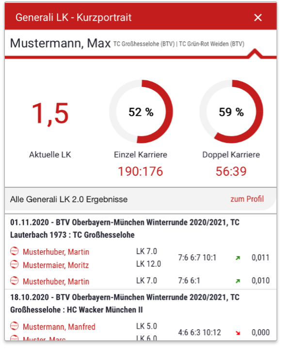 Auf Meldelisten und Turniertableaus – aber auch auf namentlichen Mannschaftsmeldungen, Spielberichten uvm. – sind Personen-Links zu finden. Im alten Portal sprang man mit einem Klick auf einen Personen-Link auf das Profil des Spielers weg, jetzt wird das neue Generali LK-Kurzportrait geöffnet. In diesem Kurzportrait sind mit der aktuellen LK, Karriere-Bilanzen und den Matches des aktuellen Jahres die wichtigsten Informationen zum Spieler enthalten – ideal für den schnellen Überblick! Wer sich genauer über diesen Spieler informieren möchte, kommt über einen Link aus dem Kurzportrait weiterhin zum Spieler-Profil.