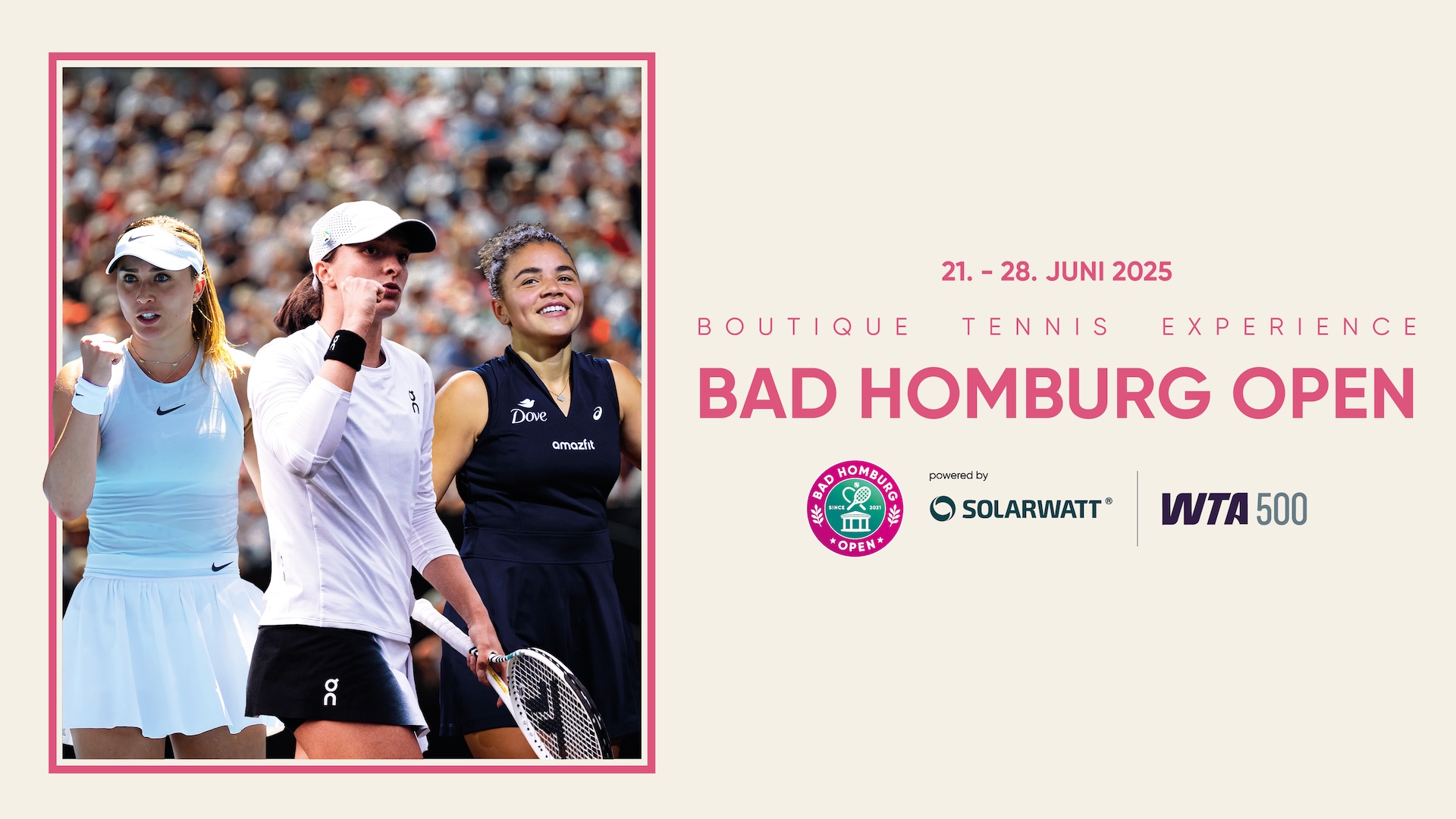 Die Bad Homburg Open powered by Solarwatt versprechen auch im Tennissommer 2026 Weltklassetennis und jede Menge Wimbledonflair! Im geschichtsträchtigen Kurpark ist bei der sechsten Auflage des Boutiqueturniers mit dem bislang stärksten Teilnehmerinnenfeld zu rechnen. Das wichtigste und größte WTA-Event in der Vorwoche von Wimbledon findet vom 20. bis 27. Juni 2026 statt!