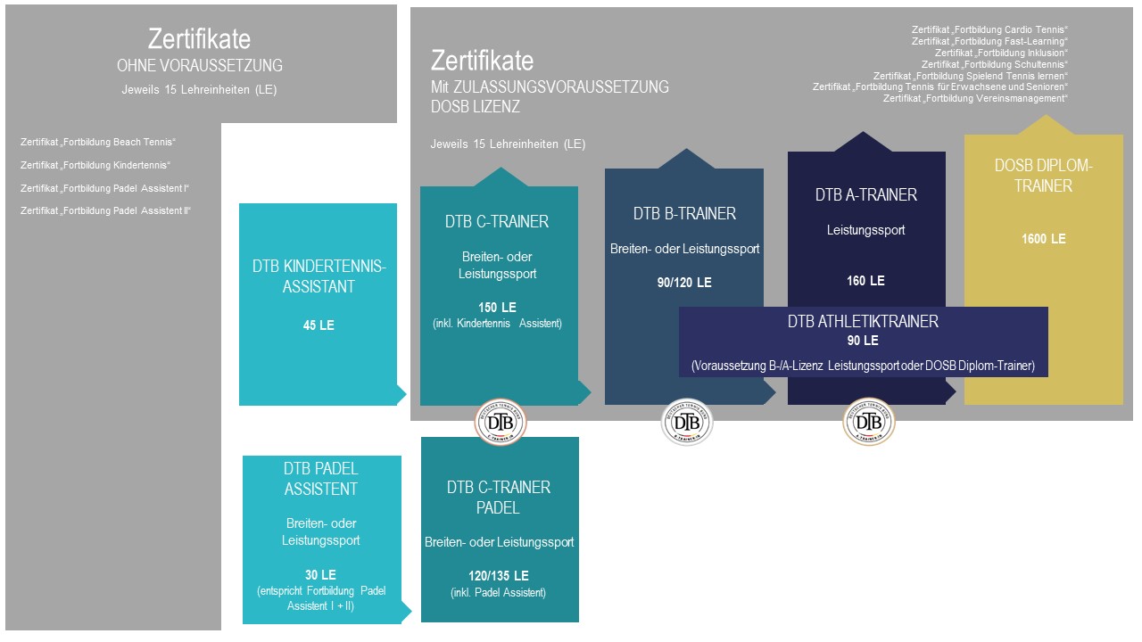 Der DTB bietet im Rahmen der Lizenzausbildungen verschiedene Ausbildungsstufen an. Folgende Grafik gibt einen Überblick über die Ausbildungsstufen.